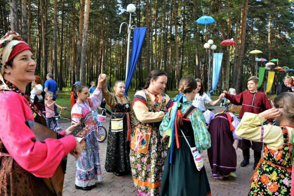 Традиционно, выступление фольклорного ансамбля началось на сцене у фонтана и продолжилось на главной аллее. В течение часа, участники ансамбля знакомили   детей  с народными играми (подвижными, круговыми хороводными, с припевами),   развивающими смекалку, внимание и умение взаимодействовать в коллективе.