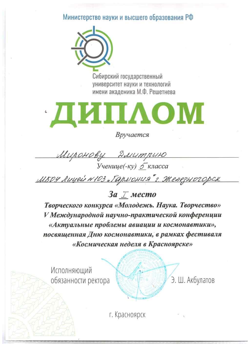 Жарков Кирилл, Парфёнов Иван – 1 место, работа «Модель Спасательного комплекса на основе пикоспутника». Руководители: Васильцова Ирина Константиновна, методист МБУ ДО «СЮТ»; Власов Дмитрий Владиславович, инженер АО «ИСС».